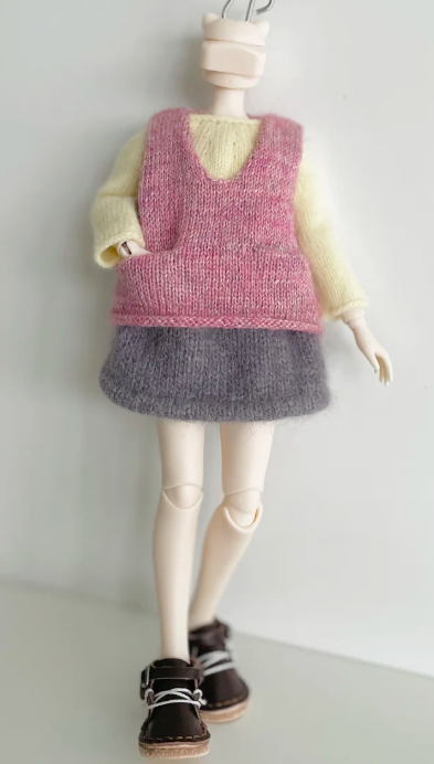 R21(织口袋行):6下,从左棒针转移11针到新棒针上,用右棒针和新棒针编织口袋1,11下,翻面不加不减片织28行,以正面行结束口袋编织,完成后将针目转移回右棒针上,12下,用同样方式织口袋2,6下